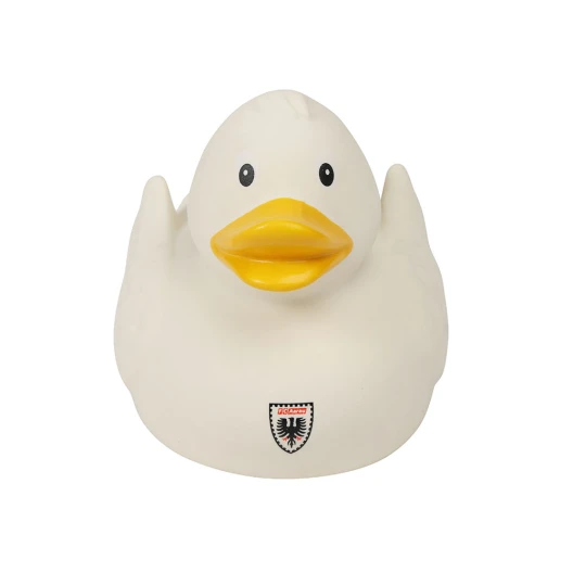Diese weisse Badeente mit FCA-Wappen bringt nachhaltigen Badespass ins Zuhause jedes Aarau-Fans! Sie besteht zu 100 % aus hochwertigem Naturkautschuk – umweltfreundlich, weich und ganz ohne Kunststoff. Durch die natürliche Beschaffenheit des Materials können leichte weisse Ablagerungen auf der Oberfläche entstehen. Das ist völlig unbedenklich und auf das natürliche Material zurückzuführen. Ein Must-have für alle, die beim Baden Stil und Nachhaltigkeit vereinen wollen!